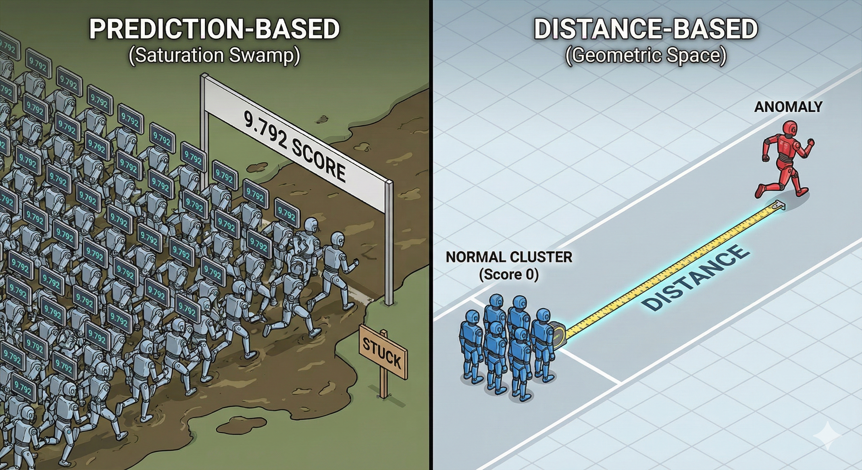 대신 질문을 바꿨습니다. "이 샘플은 정상 데이터들이 모여있는 곳에서 얼마나 멀리 떨어져 있어?"라고 묻는 '거리 기반(Distance-based)' 전략으로 전환한 것입니다. 이 새로운 방식은 정상 샘플들을 출발선(점수 0)에 모아두고, 비정상 샘플들은 최대한 멀리 밀어내는 것과 같았습니다. 질문의 전환은 모델이 좁은 점수 범위에 갇히지 않고 비정상 샘플을 기하학적으로 밀어낼 무한한 공간을 열어주는 진정한 돌파구였습니다.
